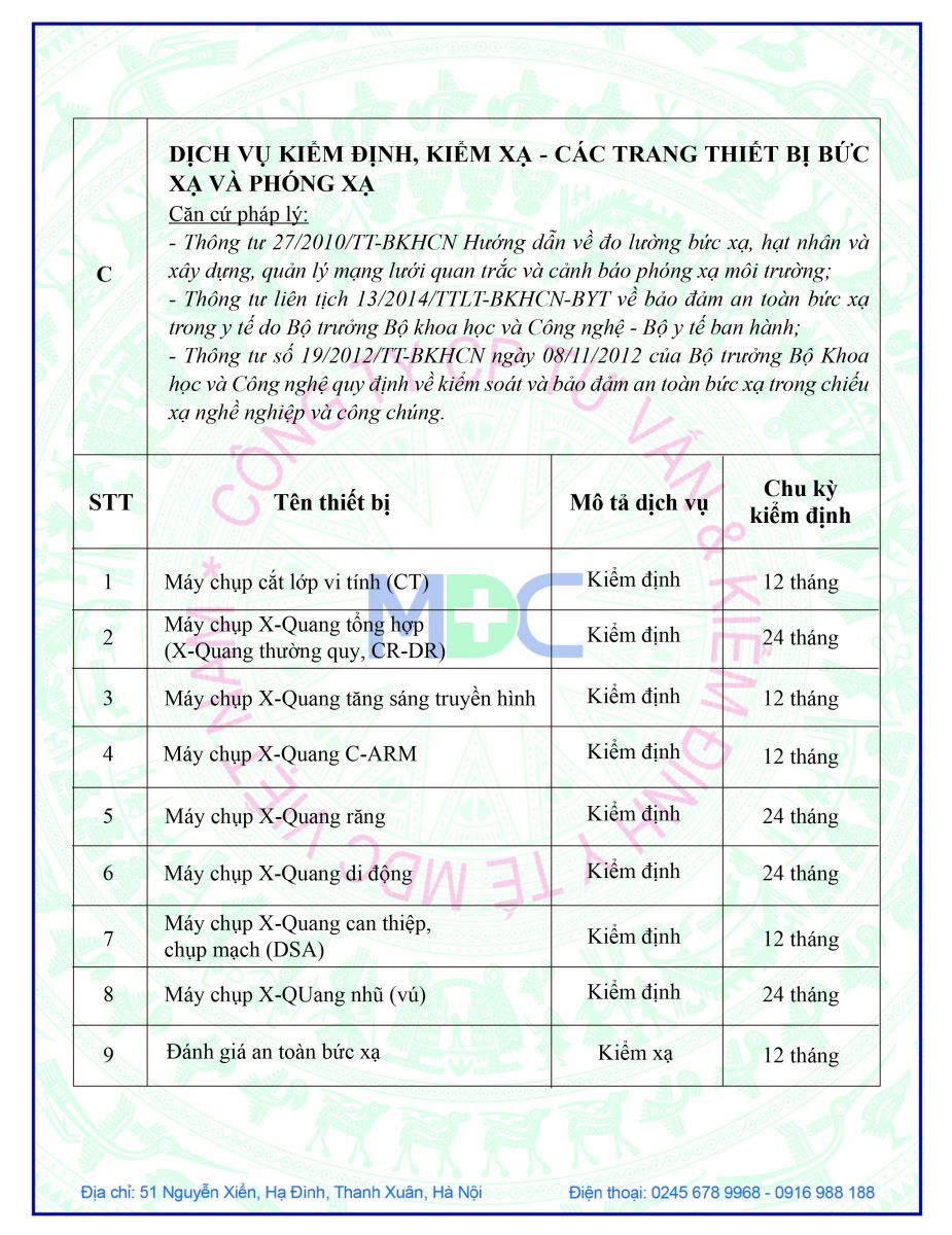 Dịch vụ kiểm định, kiểm xạ các trang thiết bị bức xạ và phóng xạ Danh mục kiểm định Dịch Vụ Đăng Ký Giấy Phép Hoạt Động Các Sản Phẩm Dịch Vụ Giám Định Dịch Vụ Kiểm Định Danh Mục Kiểm Định Danh Mục Giám Định Danh mục đăng ký giấy phép Các thông tin liên quan Quy trình thực hiện kiểm định an toàn dao mổ điện 03/05/2024 Quy trình kiểm định máy thở & kiểm định máy gây mê kèm thở 25/04/2024 DỊch vụ kiểm định - Phương tiện đo nhóm 2 22/04/2024 Dịch vụ kiểm tra an toàn và tính năng kỹ thuật trang thiết bị 22/04/2024 DỊch vụ kiểm định an toàn và tính năng kỹ thuật trang thiết bị y tế 22/04/2024 DỊch vụ kiểm định an toàn các loại máy, thiết bị, vật tư có yêu cầu nghiêm ngặt về an toàn lao động 22/04/2024 DỊch vụ hiệu chuẩn - Phương tiện đo 22/04/2024